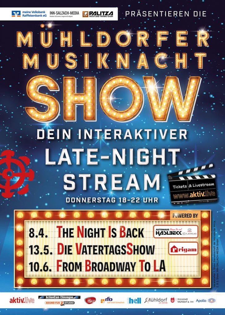 Mehr InformationenDa für viele Besucher neben der Live-Musik auch die Gemeinschaft, der Spaß und das ganze Drumherum sehr wichtig ist, haben wir ein abwechslungsreiches und abendfüllendes Programm entwickelt, das in Anlehnung an eine Fernsehshow ein Erlebnis für die ganze Familie sein soll. „Dabei wollen wir die vielen neuen und digitalen Möglichkeiten, wie Live-Chat u.a. nutzen und anbieten“, so Organisator und Moderator Andreas Seifinger. Geplant sind zwei Staffeln, eine im Frühjahr/Sommer und eine im Herbst/Winter 2021, mit je 3 Shows. Und jede Show erhält ein eigenes Motto. Der Name war schnell gefunden: Die „Mühldorfer Musiknacht SHOW“. Spaß, Musik und Talk – live in die ganze Welt hinaus gestreamt. Da in Mühldorf bereits vor vielen Jahren der Donnerstag immer der Party-Tag war, kommen wir zurück auf diese Tradition.