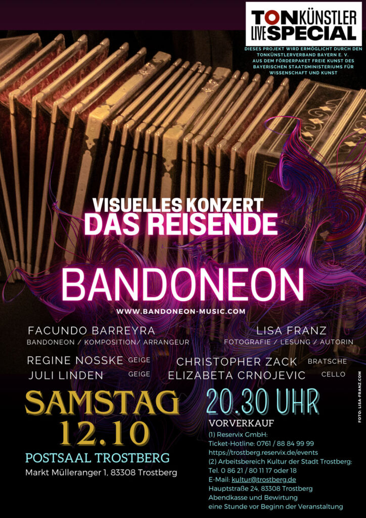 Mit ihrem Programm „Das reisende Bandoneon“ schaffen die Künstler Facundo Barreyra, Lisa Franz und das Münchern Streichquartett auf spielerische und künstlerische Art und Weise einen Kulturaustausch zwischen Deutschland und Argentinien. Dafür komponiert und arrangiert Facundo Barreyra für die Besetzung Bandoneon und Streichquartett Milongas, Walzer und Tangos. Die Besetzung Bandoneon und Streichquartett funktioniert wie ein kleines Tangoorchester. Erläuternd werden dazu u. a. Texte der Fotografin und Autorin Lisa Franz gelesen und ihre Fotoserie „Das reisende Bandoneon“ gezeigt.