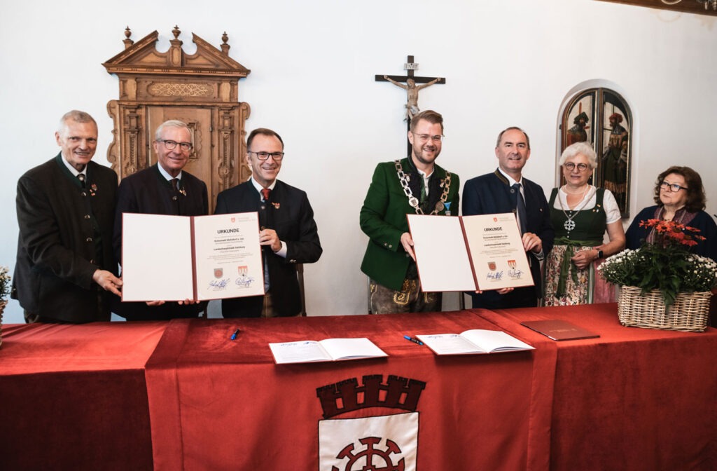 Bild: Nach der Unterzeichnung der Städtepartnerschaftsurkunden von links: Prof. Dr. Josef Schöchl, Dr. Wilfried Haslauer, Bernhard Auinger, Michael Hetzl, Hubert Aiwanger, Ilse Preisinger-Sontag und Christa Schmidbauer.