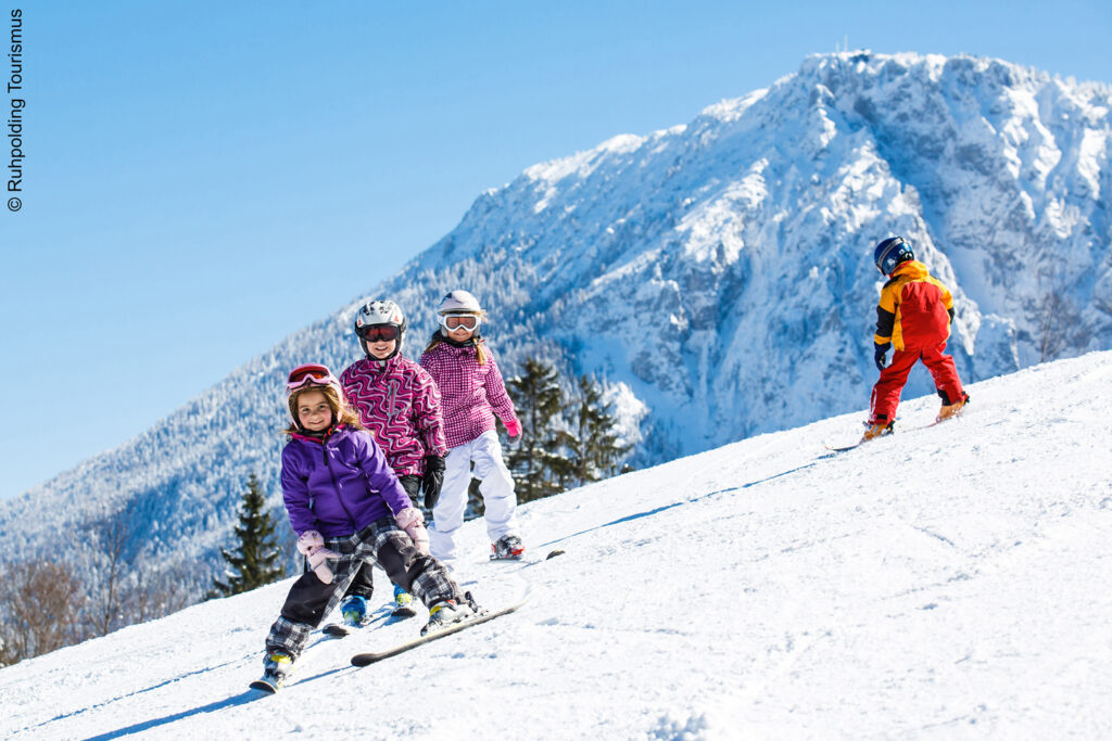 Der Unternberg in Ruhpolding bietet mit verschneiter Landschaft, malerischer Bergkulisse und perfekt präparierten Skipisten die idealen Voraussetzungen für einen entspannten Wintertag mit Freunden und Familie.